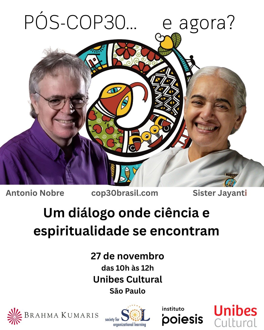 O evento reúne Antonio Nobre, cientista e pesquisador da Amazônia, e Sister Jayanti, líder espiritual da Brahma Kumaris, para refletir sobre os próximos passos da humanidade diante das mudanças climáticas.